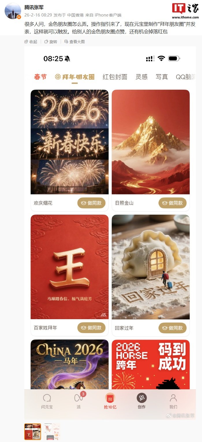 - Creation via Yuanbao App: Within the Yuanbao app, users can navigate to "Creation," locate the "New Year’s greetings circle of friends," and generate a unique picture to share in their friend circle.